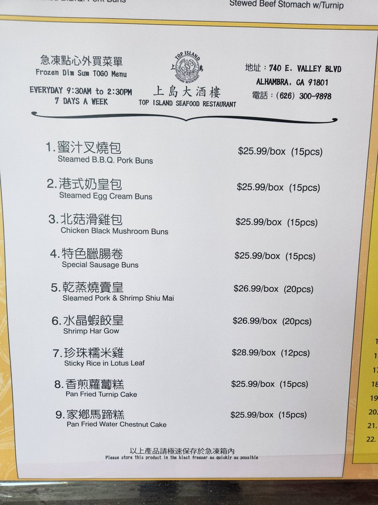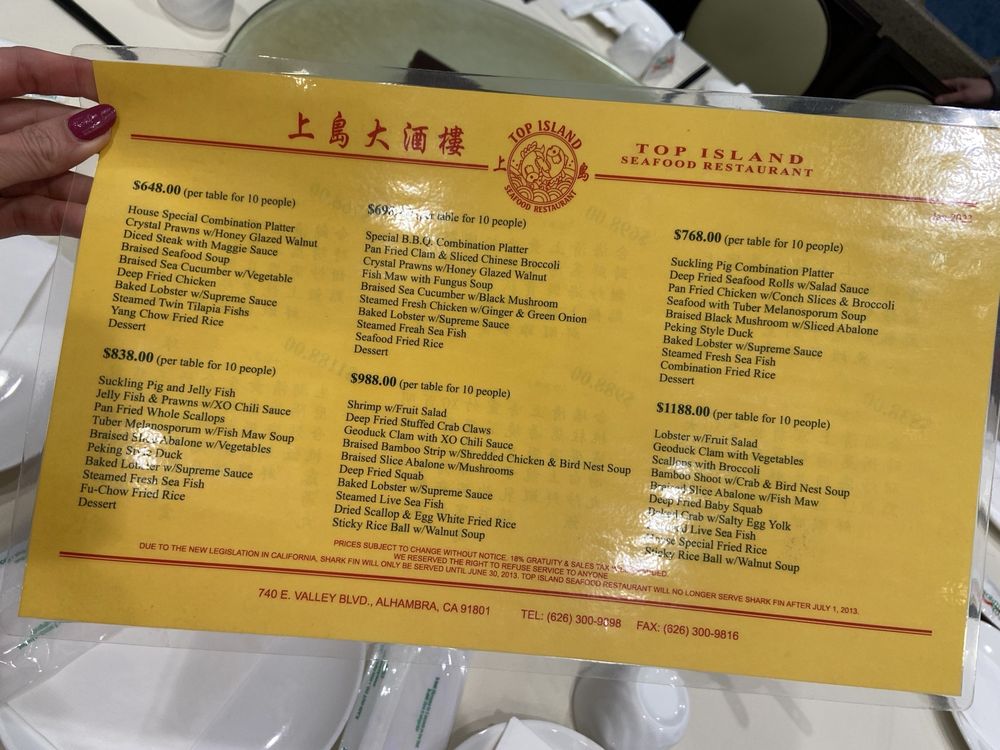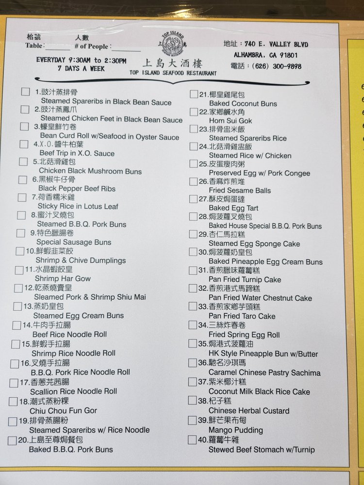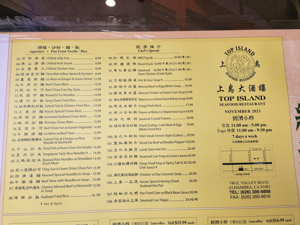 Introducing the menu at Top Island Seafood, a Cantonese restaurant in Alhambra, CA, offers a delightful fusion of Dim Sum and Seafood dishes. With a wide range of options, including Vegan and Vegetarian choices, this restaurant caters to every palate. The establishment provides excellent amenities such as reservation services, delivery, and takeout. The menu boasts of signature dishes like honey walnut shrimp, fish maw soup, and braised pork belly. Customers rave about the quality of food, affordable prices, and attentive service. The ambiance is perfect for group dinners or intimate date nights. Don't miss out on the lobster or crab specials, as recommended by regular patrons. Top Island Seafood promises a memorable dining experience filled with authentic Cantonese flavors and impeccable service.